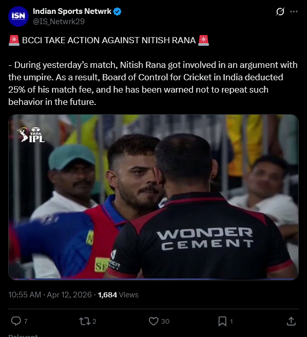 According to ESPN cricinfo, Nitish Rana has been penalized 25% of his match fee and handed one demerit point for breach of IPL Code of Conduct (Article 2.3) which deals with the use of an audible obscenity during a match, the IPL has confirmed after the match. Rana has admitted to the offense and agreed to the match referee’s sanction.